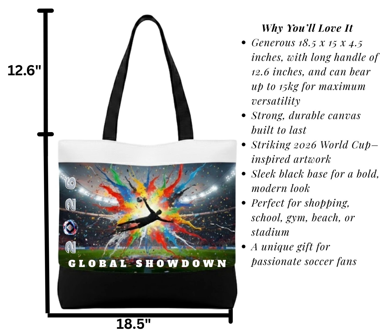 Bold 2026 World Cup–inspired canvas tote bag ( 18.5 x 15 x 4.5 inches wide, with a long handle of 12.6 inches, and can bear up to 15kg) with a sleek black base. Durable, spacious, and perfect for shopping, school, gym, or match day. A stylish everyday essential for true soccer fans.