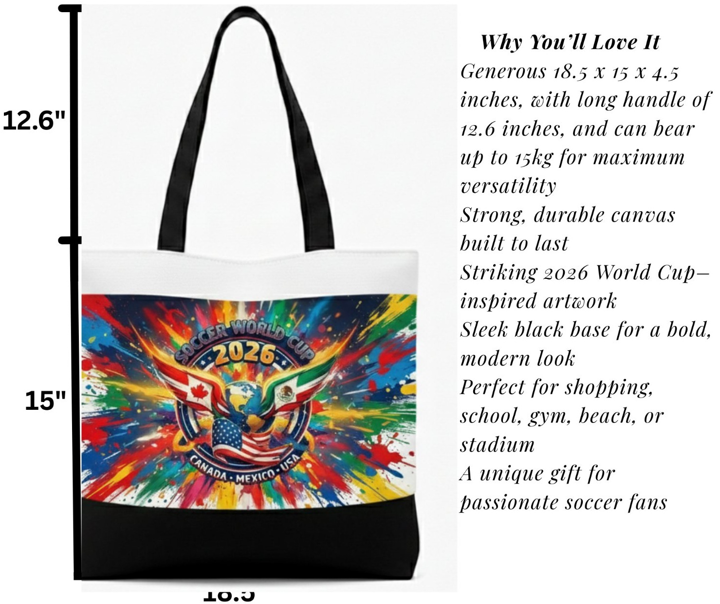 Bold 2026 World Cup–inspired canvas tote bag ( 18.5 x 15 x 4.5 inches wide, with a long handle of 12.6 inches, and can bear up to 15kg) with a sleek black base. Durable, spacious, and perfect for shopping, school, gym, or match day. A stylish everyday essential for true soccer fans.